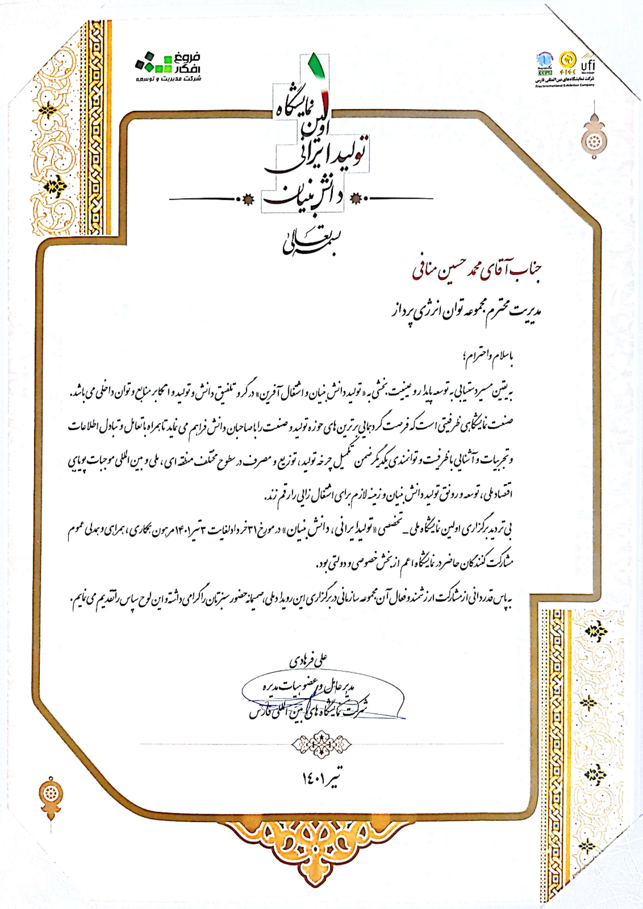 اولین نمایشگاه تولید ایرانی دانش بنیان ازتاریخ 31 خرداد تا 4 تیر ماه 1401 در محل نمایشگاه بین المللی فارس برگزار شد و شرکت توان انرژی پرداز نیز دراین نمایشگاه شرکت نمود که مورد بازدید معاون محترم هماهنگی امور اقتصاد استانداری، معاون محترم سیاسی، امنیتی و اجتماعی استانداری، معاون محترم توسعه مدیریت منابع استانداری فارس، رئیس سازمان صمت و هیئت محترم همراه ایشان، قرار گرفت.