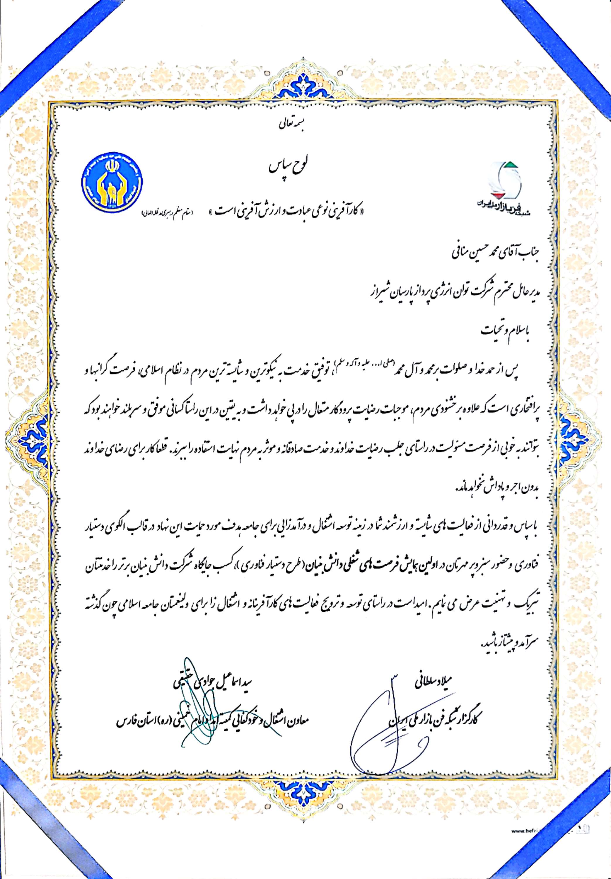 دریافت لوح تقدیر راه اندازی اتوماسیون ملی صنعت برق از ریاست محترم پارک علم و فناوری فارس