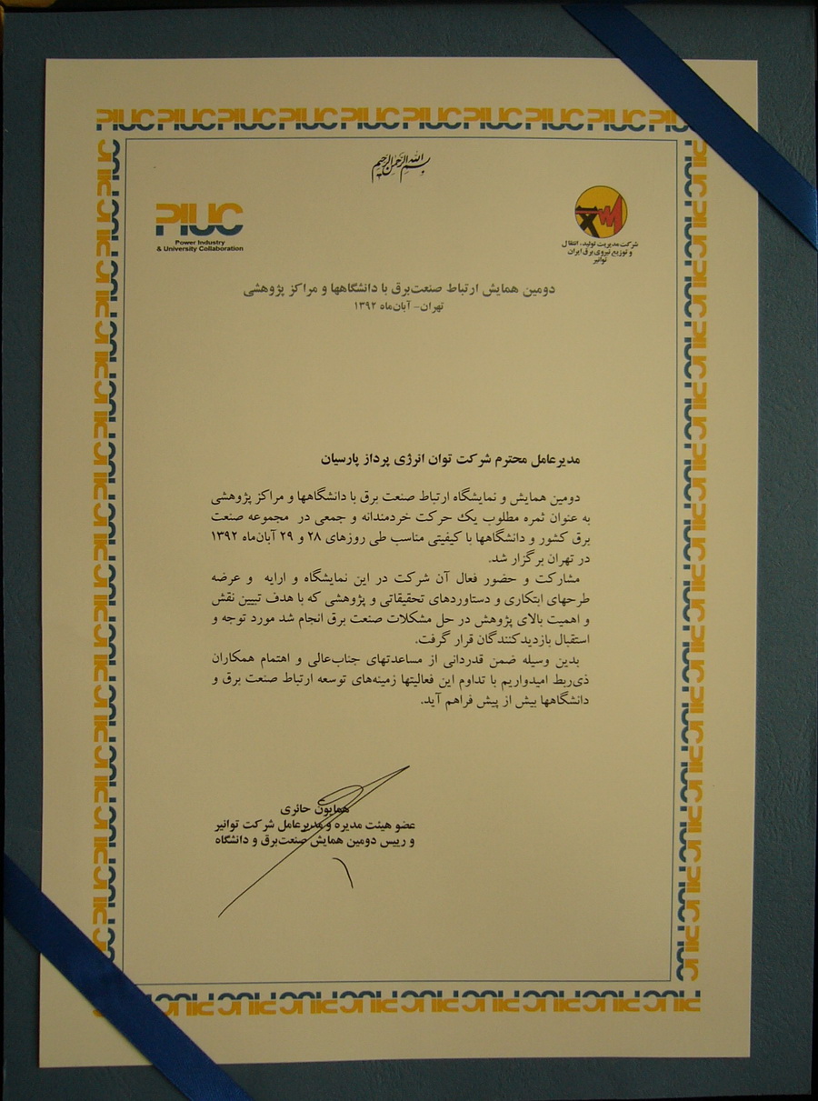 دومین همایش ارتباط صنعت برق با دانشگاه ها و مراکز پژوهشی در تاریخ 28 تا 29 ابان ماه 1392در محل نیروگاه بهره برداری طرشت تهران برگزار شد و شرکت توان انرژی پرداز نیز در نمایشگاه جانبی این همایش که مورد بازدید مدیر عامل محترم شرکت توانیر، جناب آقای مهندس حائری قرار گرفت، شرکت نمود و لوح تقدیر نیز از طرف شرکت محترم توانیر به این شرکت اعطا شد .