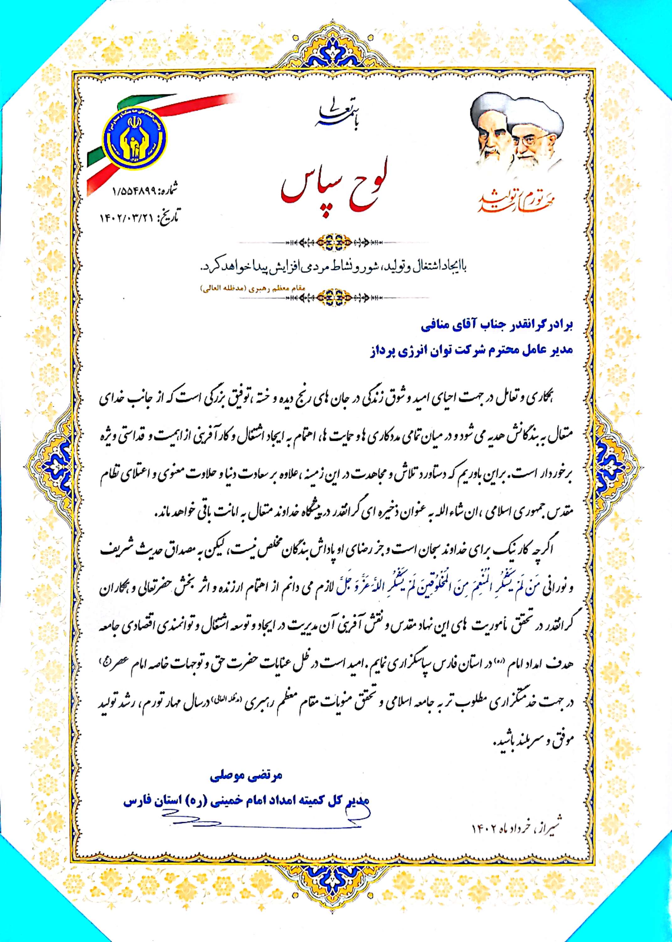 حضور شرکت توان انرژی پرداز پارسیان در نمایشگاه خودکفایی و توانمندی اقتصادی 7100 مجری طرح اشتغال امداد امام (ره) که در مورخ 25 خرداد 1402 در مؤسسه استنادی و پایش علم و فناوری جهان اسلام، شیراز برگزار شد و مورد بازدید مقامات محترم کشوری، استانی و هیئت محترم همراه ایشان، قرار گرفت و لوح تقدیر توسط قائم مقام کمیته امداد امام خمینی (ره) نیز به این شرکت اهدا شد.