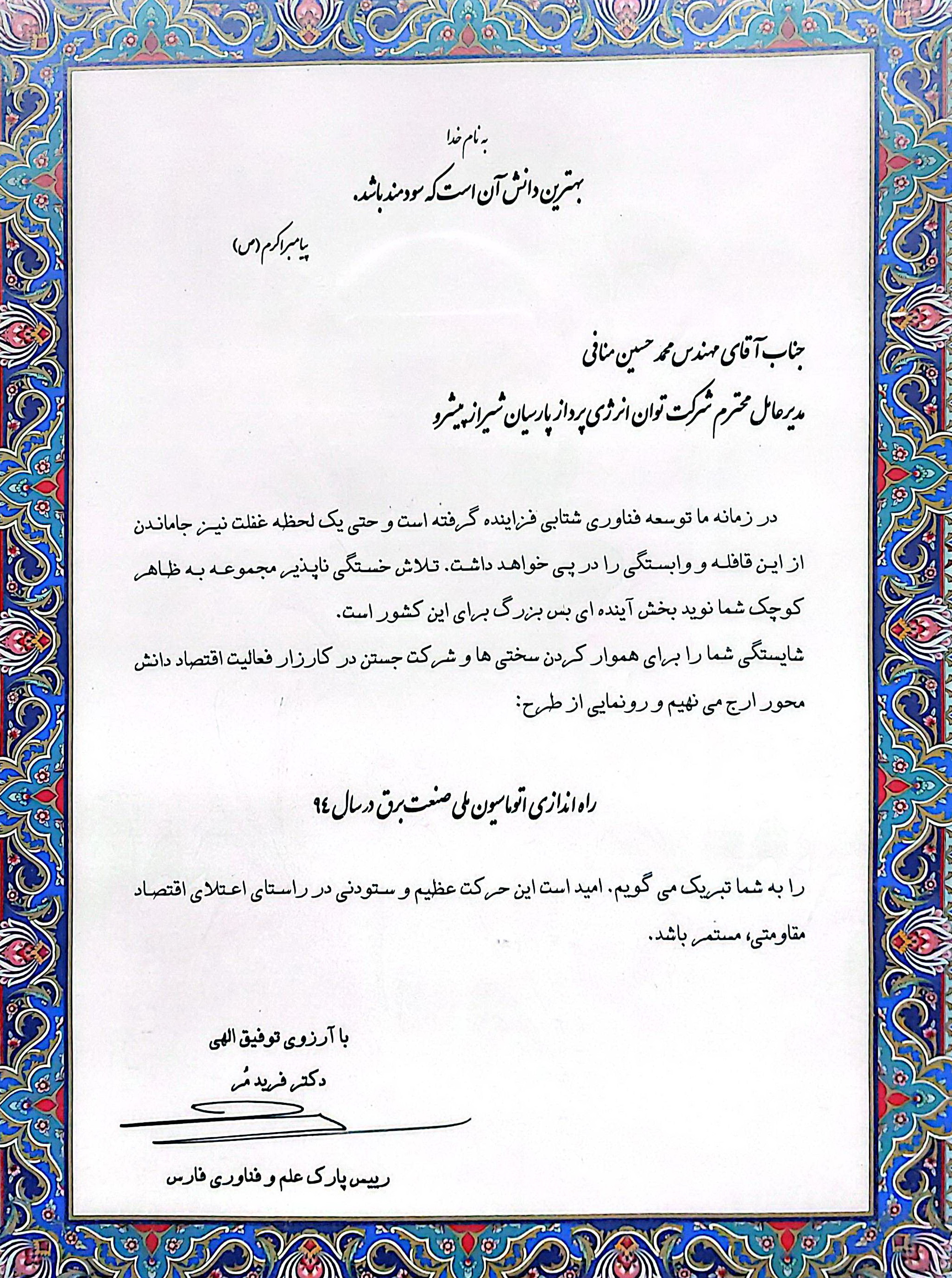 دریافت لوح تقدیر راه اندازی اتوماسیون ملی صنعت برق از ریاست محترم پارک علم و فناوری فارس
