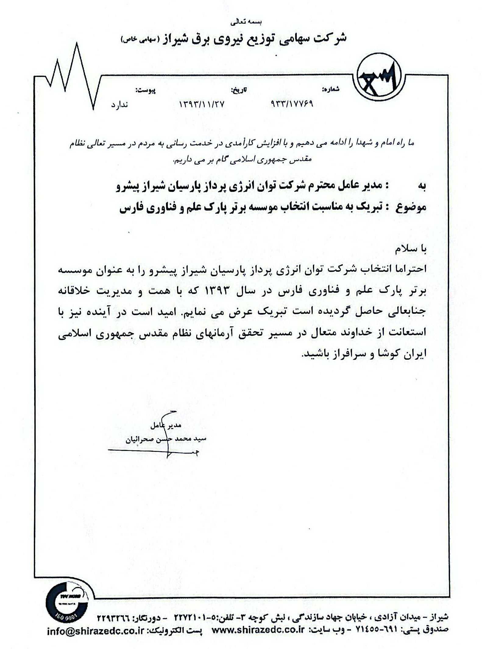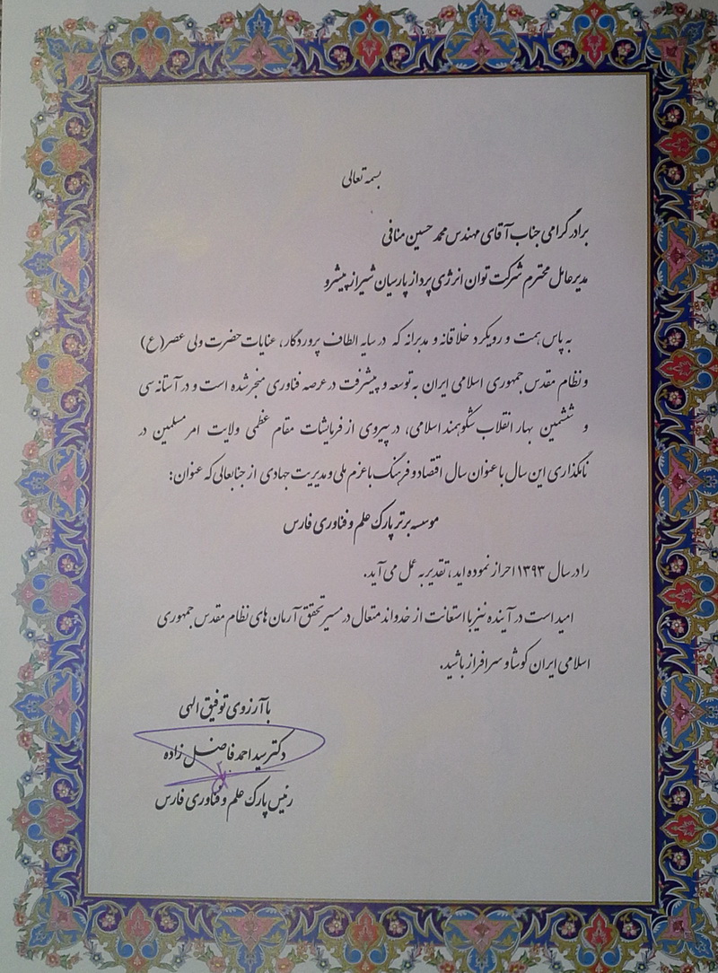 همزمان با سی و ششمین سالگرد پیروزی انقلاب اسلامی ایران، مراسم جشن با شکوهی با حضور دکتر سید احمد فاضل زاده، ریاست محترم پارک علم و فناوری فارس، دکتر عبدالحسین فریدون، مشاور وزیر علوم، تحقیقات و فناوری و مدیر کل دفتر وزارتی، دکتر علی اصغر توفیق معاون آموزش،پژوهش و فناوری وزارت صنعت، معدن و تجارت، مهندس نیره پیروزبخت رئیس سازمان ملی استاندارد ،حجت الاسلام رضوی، امام جمعه موقت شیراز و تعداد زیادی از نمایندگان استان فارس در مجلس شورای اسلامی، در محل سالن اجلاس پارک علم و فناوری فارس برگزار گردید، که در این مراسم این شرکت موفق به دریافت عنوان موسسه برتر سال 1393 پارک علم و فناوری فارس گردید .